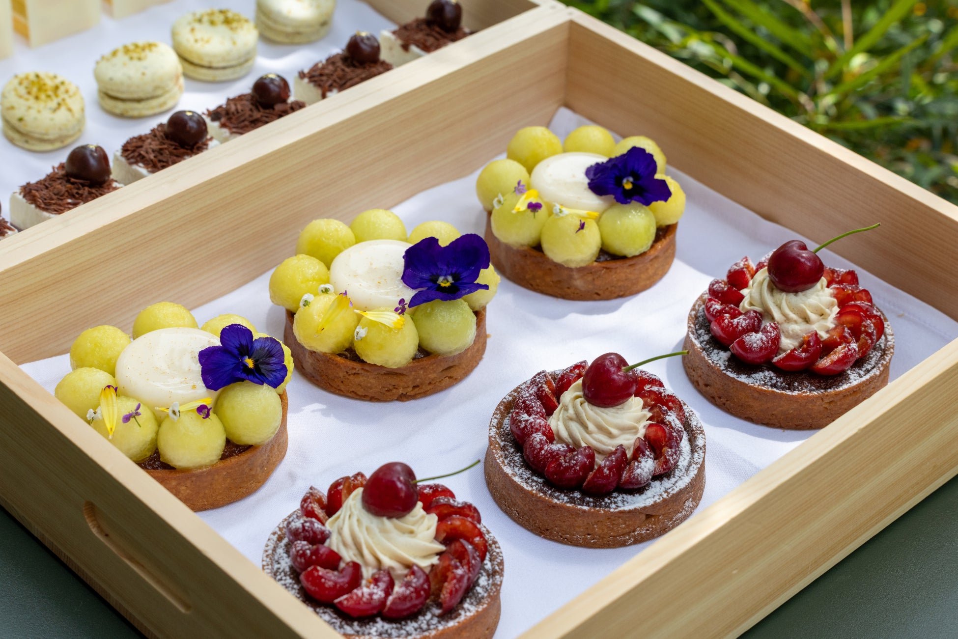 お好みに合わせてお選びいただく「季節のクロスタータ」は2種類をご用意。静岡県産マスクメロンを贅沢に使用した「メロンとシャンパーニュのクロスタータ」は、フロマージュブランのムースにまとわせたシャンパーニュジュレが大人の味わいを引き立てる、目にも鮮やかな一品です。「アメリカンチェリーのクロスタータ」は、ローストしたピスタチオの風味と爽やかなチェリーの酸味が絶妙なハーモニーを奏でる、華やかな味わいのスイーツです。