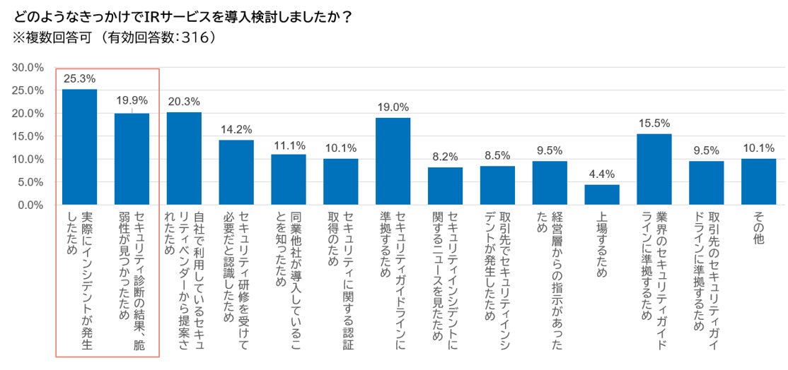 導入のきっかけで多かったのは「実際にインシデントが発生したため」、「セキュリティ診断の結果、脆弱性が見つかったため」でした。