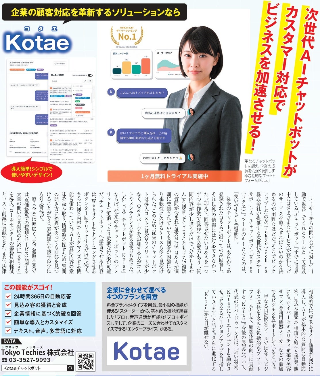 Tokyo Techies株式会社(本社:東京都台東区、代表取締役:ドバ・ドゥック)が開発・提供する次世代AIチャットボット「Kotae(コタエ)」が、日経トレンディ8月号に広告記事として掲載されました。