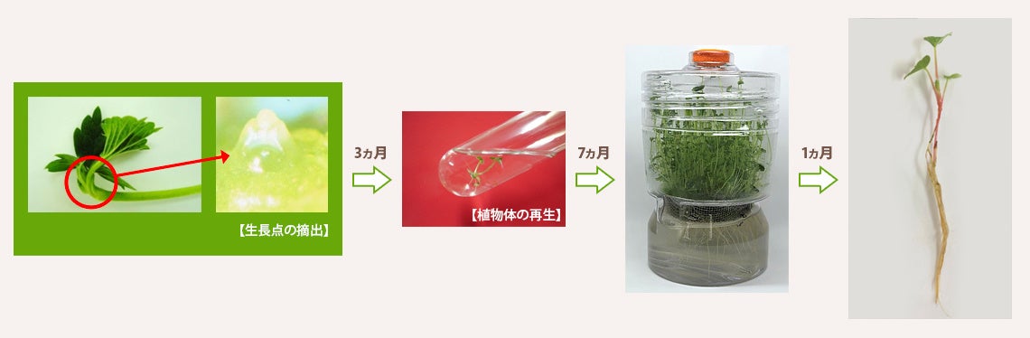 メリクリーン苗の生産は、ランナーの先端の若葉をめくり、その中にある生長点と呼ばれる0.3~0.5mmの微細な細胞を採取し、移植した培地で1本の小さな苗を育てる「生長点培養」という工程から始まります。当社の強みは、液体培地を用いる「液体培養法」を採用し、専用の培養装置で増殖することで、一般的な「固形培養法」と比較して約数百倍の効率で高品質な苗を安定生産できる点にあります。