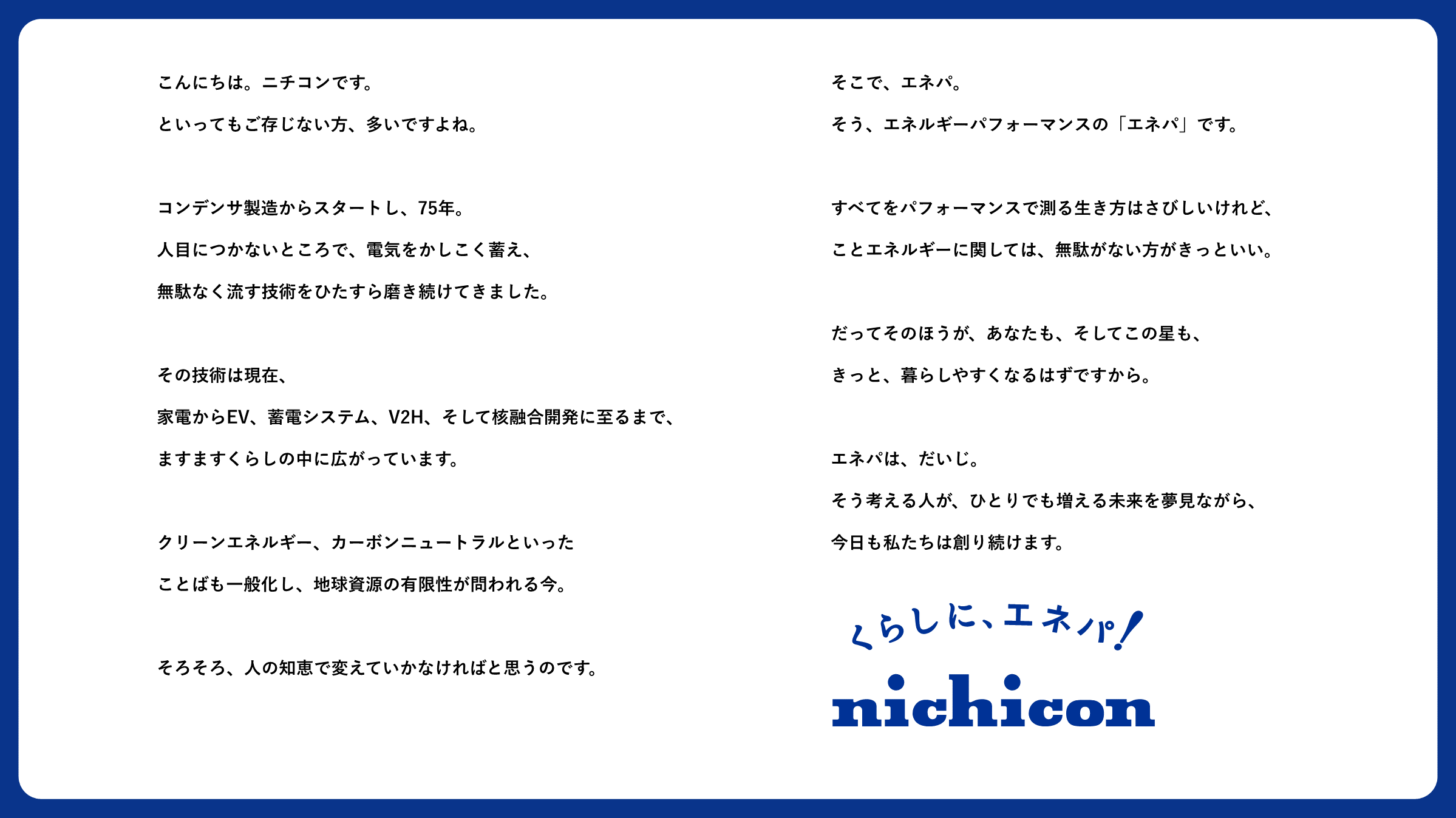 新ブランドコピー「くらしに、エネパ!」を掲げ“蓄電のニチコン”から“エネルギーソリューションのニチコン”へ
