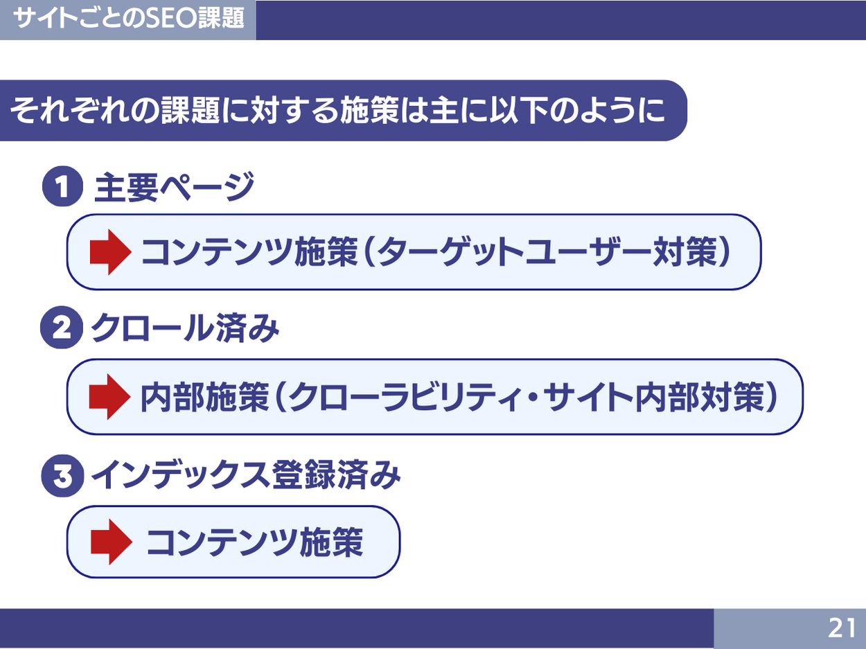 当社のSEOコンサルタントが、サイトのSEO課題とそれぞれの課題で行うべき施策について解説します。