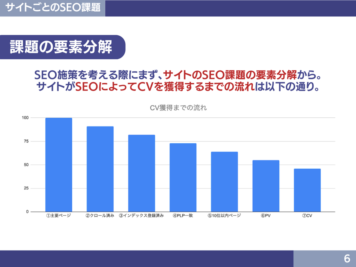 サイトのSEO課題は上記のように分解されます。サイトの主要ページが①〜⑦の段階を経ることで顧客の獲得につながります。