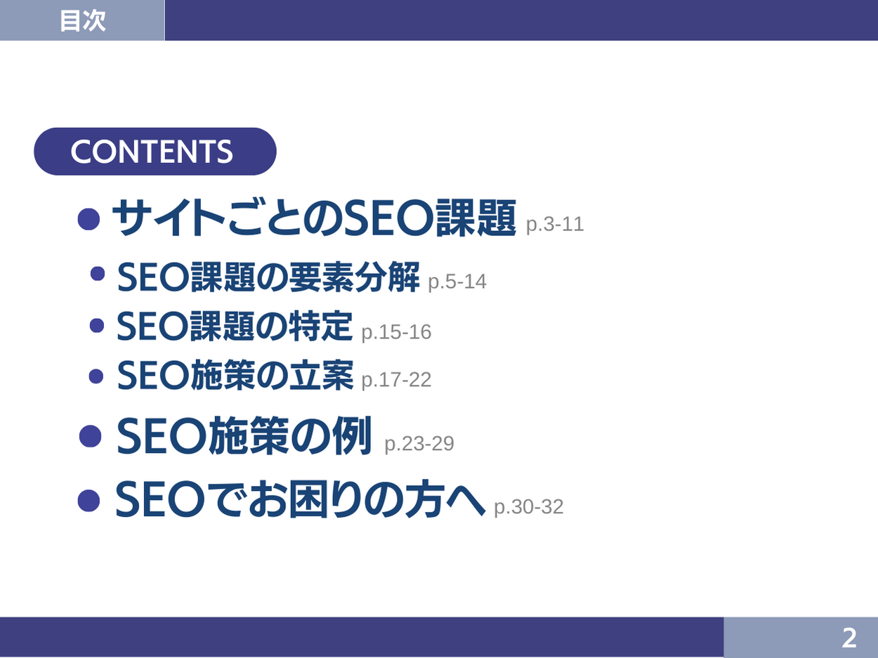 今回のレポートではSEO戦略を立てる上で欠かせないサイトごとのSEO課題やSEO施策の例などの基礎知識をまとめています。