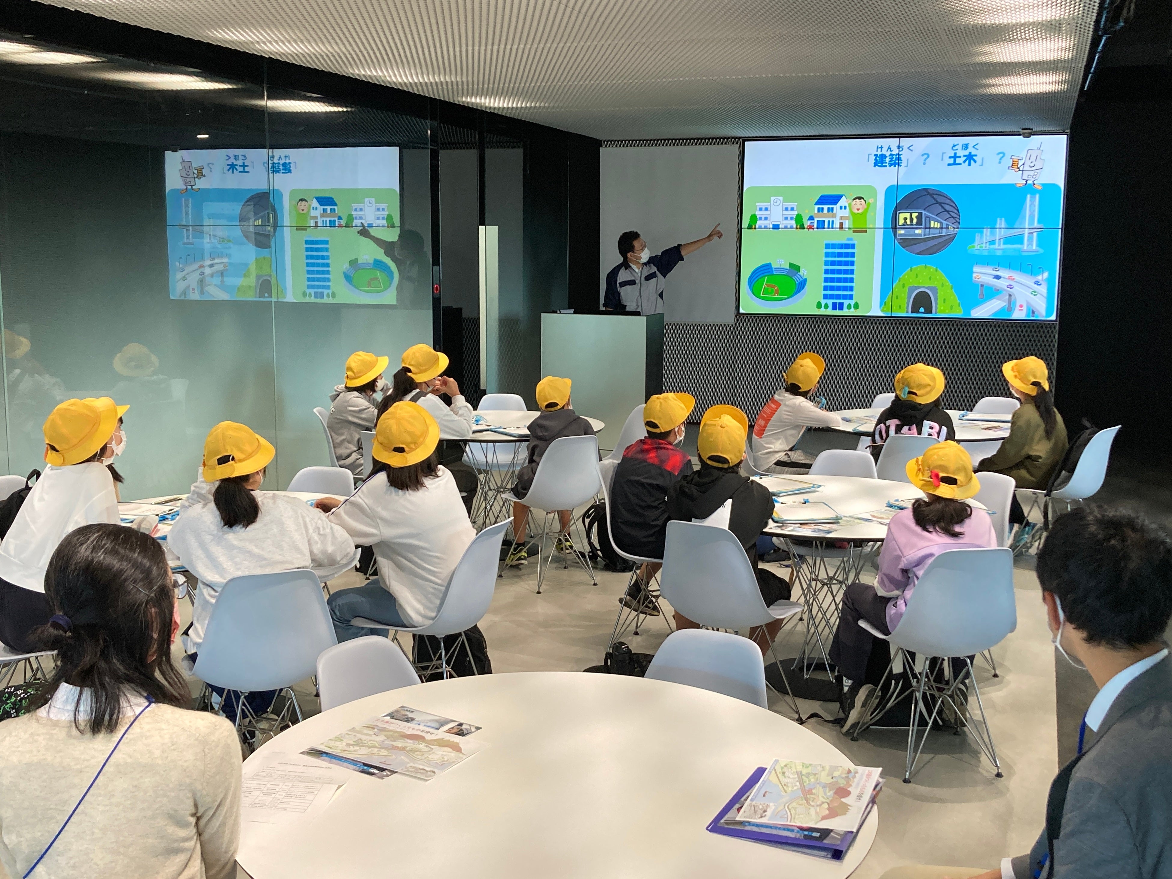 「土木の日」の由来や建設会社の仕事、身近にある“土木”や“建築”について説明を行い、建設業の社会的使命や魅力を紹介しました。