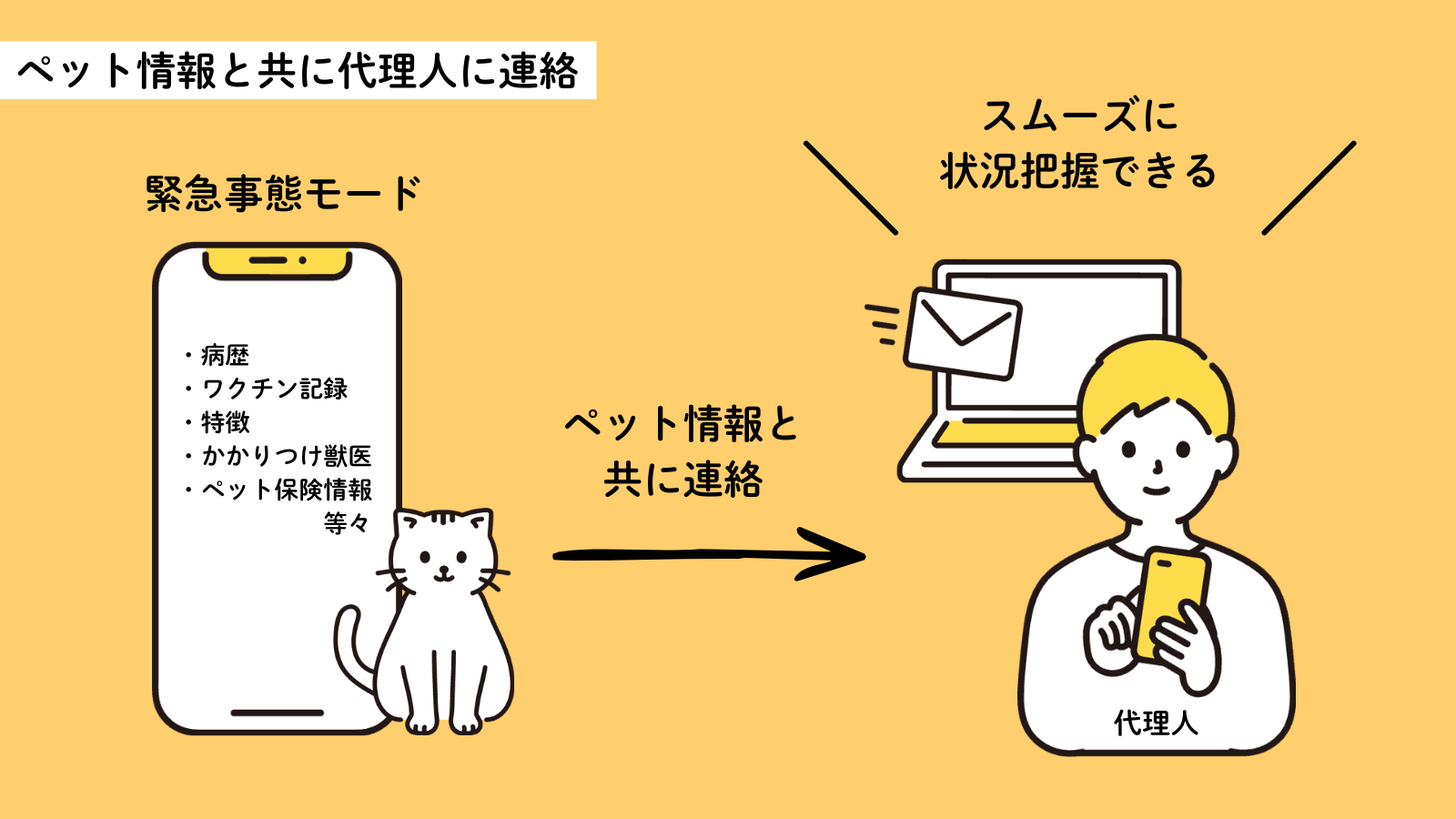 仕組みはとてもシンプル。飼い主は毎日、アプリのボタンをひとつ押すだけ。それが水面下で「生存確認」として記録されます。もし48時間以上記録が途絶えた場合、アプリが自動で緊急事態と判断し、あらかじめ登録した代理人(家族や知人)へメールを送信します。その際、ワクチン履歴・かかりつけ動物病院・日々のお世話情報といったペットの引き継ぎに必要な情報も同時に届きます。