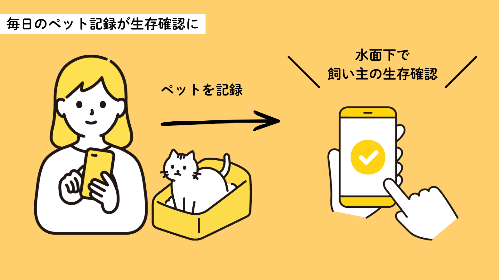 ①毎日ボタンひとつでペットを記録→水面下で「飼い主の生存確認」