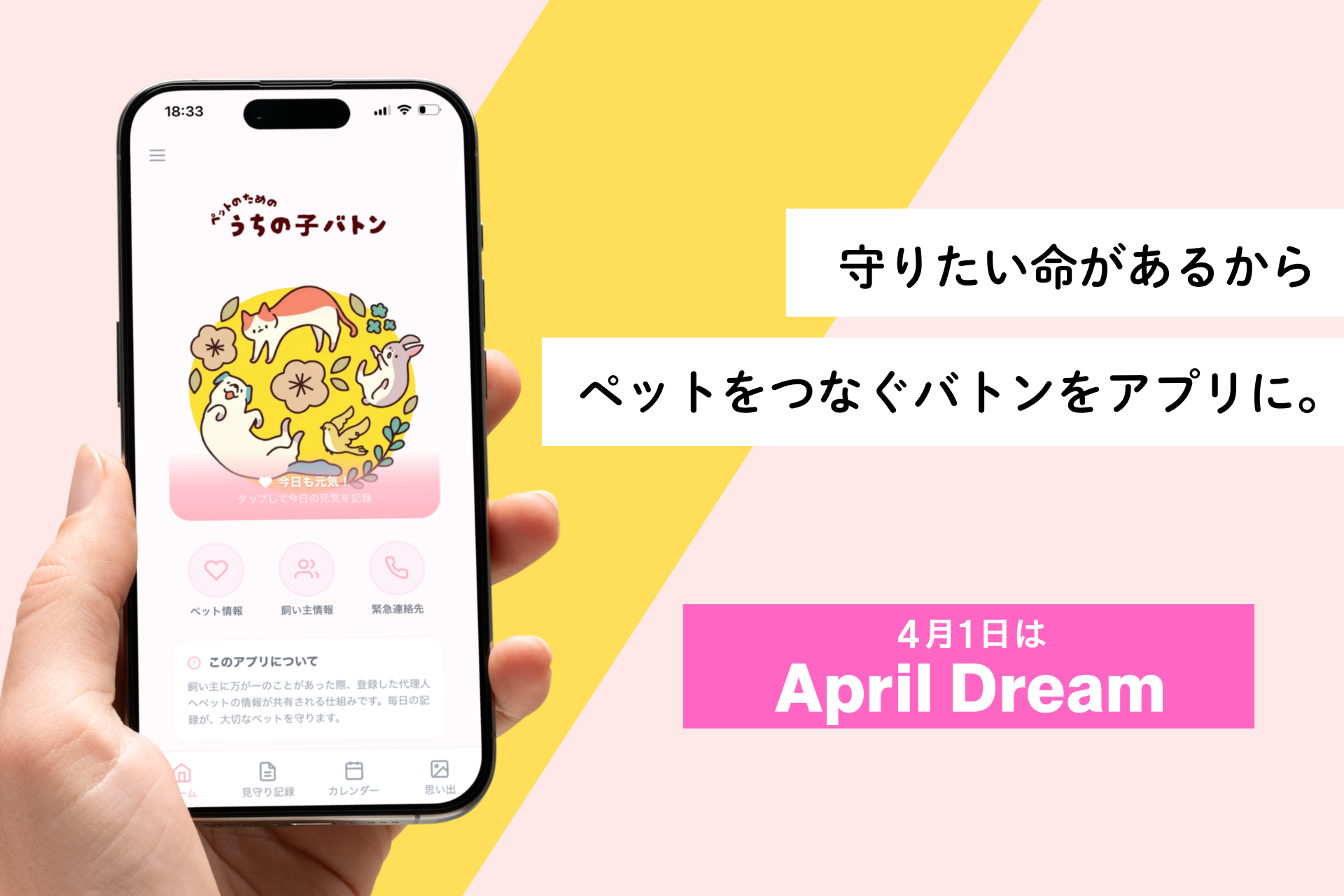 当社は、「飼い主のもしもにペットを巻き込まない」というテーマでApril Dreamプロジェクトに参加し、開発中のアプリ「うちの子バトン」の取り組みと、その先にある叶えたい未来を発信します。