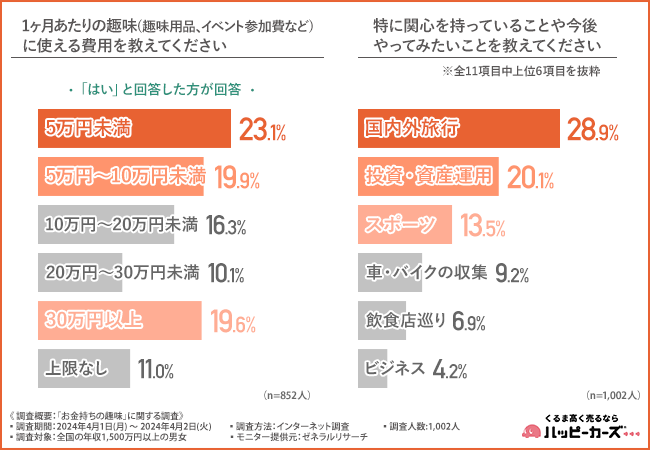 株式会社ハッピーカーズ(本社所在地:神奈川県鎌倉市、代表取締役:新佛 千治)は、全国の年収1,500万円以上の男女を対象に、「お金持ちの趣味」に関する調査を実施しました。