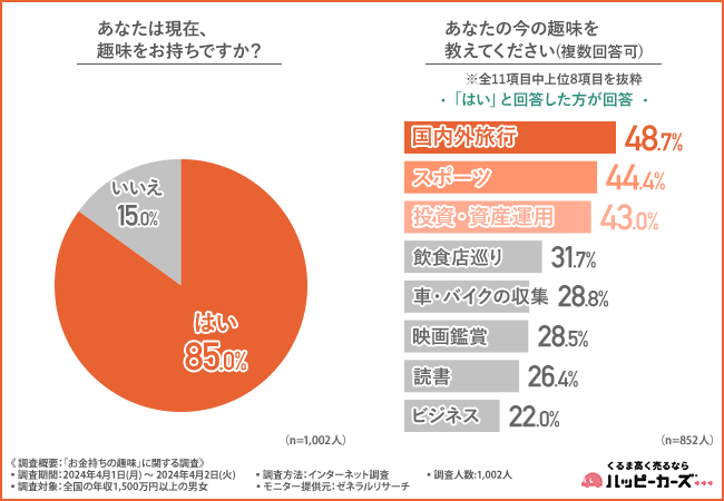 そこで今回、車買取り専門店の株式会社ハッピーカーズ(https://happycars.jp/)は、全国の年収1,500万円以上の男女を対象に、「お金持ちの趣味」に関する調査を実施しました。