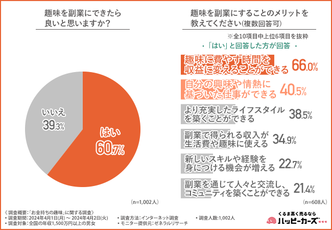 さらに、趣味を副業にできたら良いと思う方は6割に上り、趣味に費やす時間を収益に変えられることや、興味や情熱に基づいた仕事ができるといったメリットを感じていることが示されました。