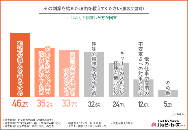 メインの仕事以外で収入を得るために副業を始めた方が多いことが示されました。