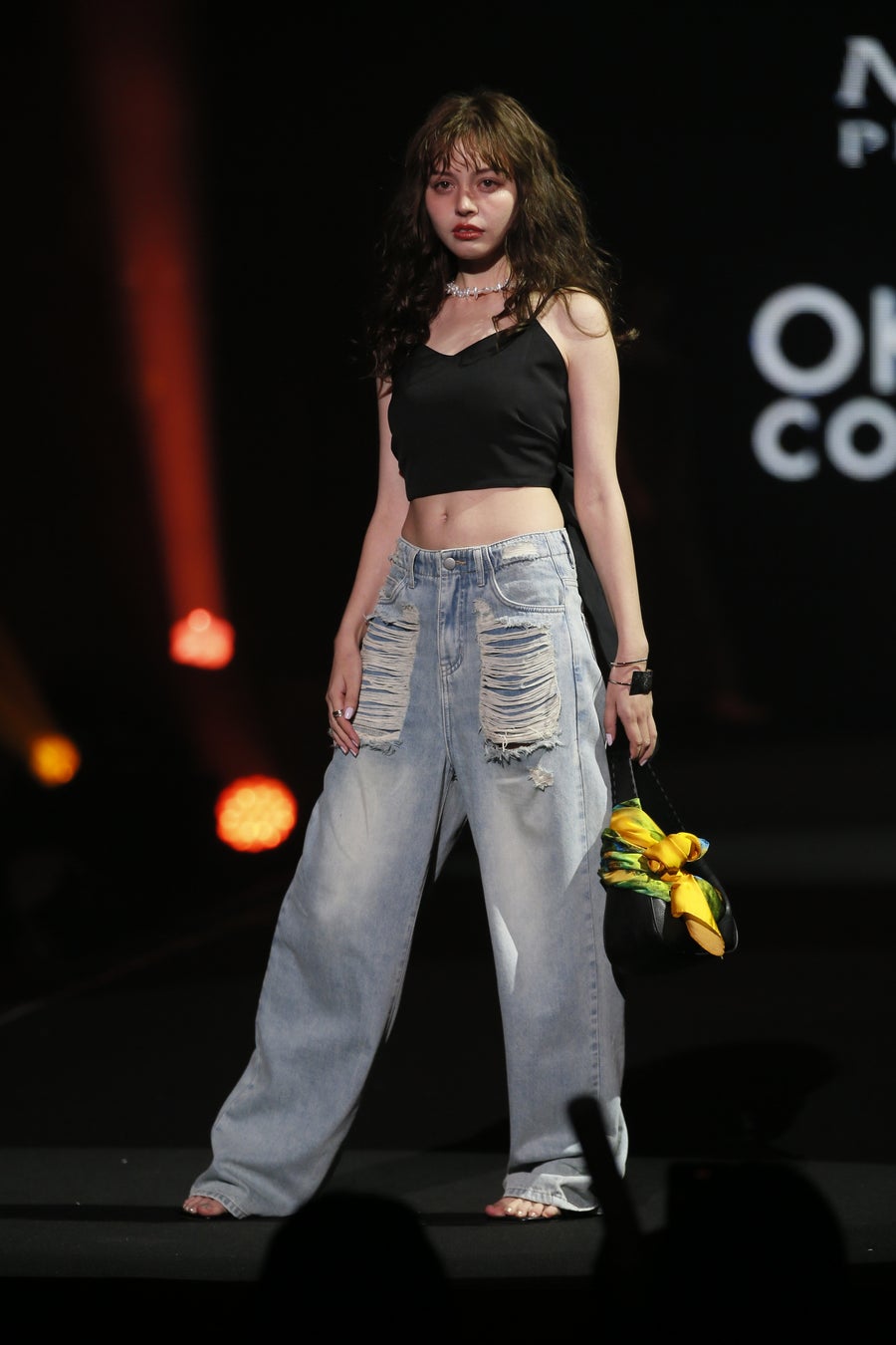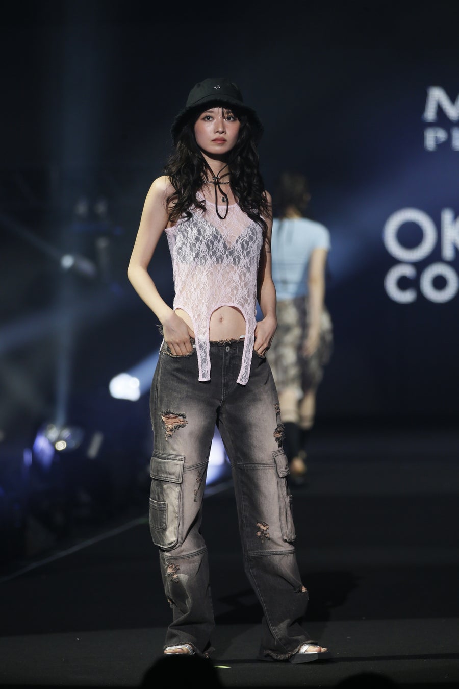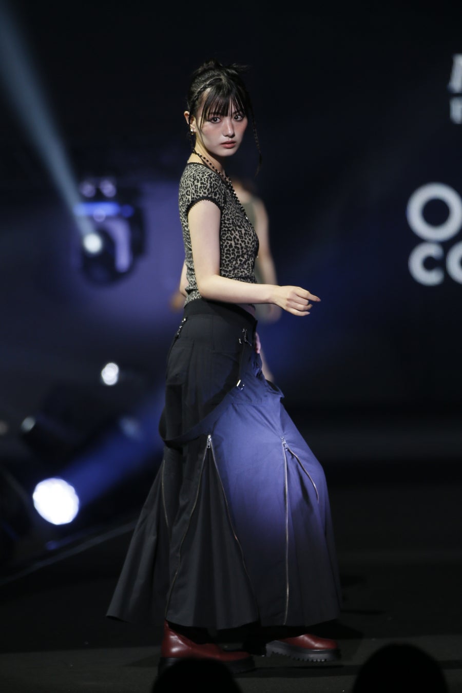 「レトロ」「カジュアル」をメインコンセプトに、独自のアクセントをプラスした、ルールレスなコレクションを展開する「Boka nii」は、プロデューサーを務めるYouTuberかすがオールブラックコーデにキラキラとした夏らしさをプラスしたルックで登場。モデルの那須ほほみは、グレートップス×ブラックデニムのクールでアーバンなスタイルをまとい、爽やかな笑顔で会場を魅了しました。