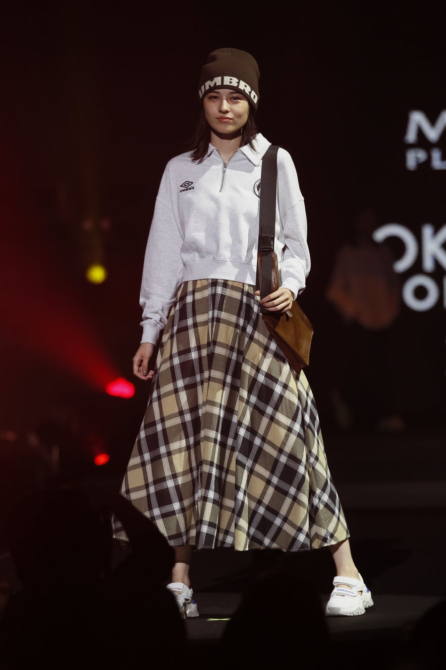 「ミュゼプラチナム Presents OKINAWA COLLECTION 2024 」のファッションステージは、ブランド創設から100周年を迎えた「UMBRO」のロゴが際立つレッドストール×オーバーシルエットがキュートなスウェットに身を包んだ中町綾がファーストルックを務めました。モデルのNiki、入江美沙希、Sora(アバンティーズ)らが、今季注目のKEYカラー・ブルーを取り入れたスポーティーカジュアルなファッションをまとってランウェイし、会場を盛り上げました。