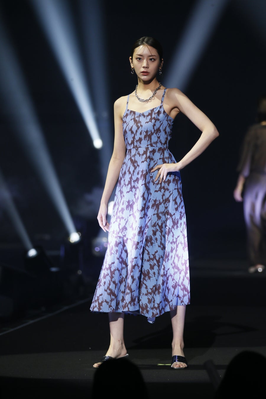 ブラックを基調としたクールなマスキュリンをベースにメリハリの効いたスタイルシルエットを実現したアイテムがそろう「MURUA」。入江美沙希が一際目を引くレッドのキャミソールにメタリックスカートを合わせた都会的なファッションで登場し、古田愛理はアースカラーのセットアップにビタミンカラーのインナーを効かせたルックを披露しました。モデルの貴島明日香は大胆にあしらわれたプリントが夏らしいワンピースを身にまとい、クールなウォーキングでステージを締めくくりました。