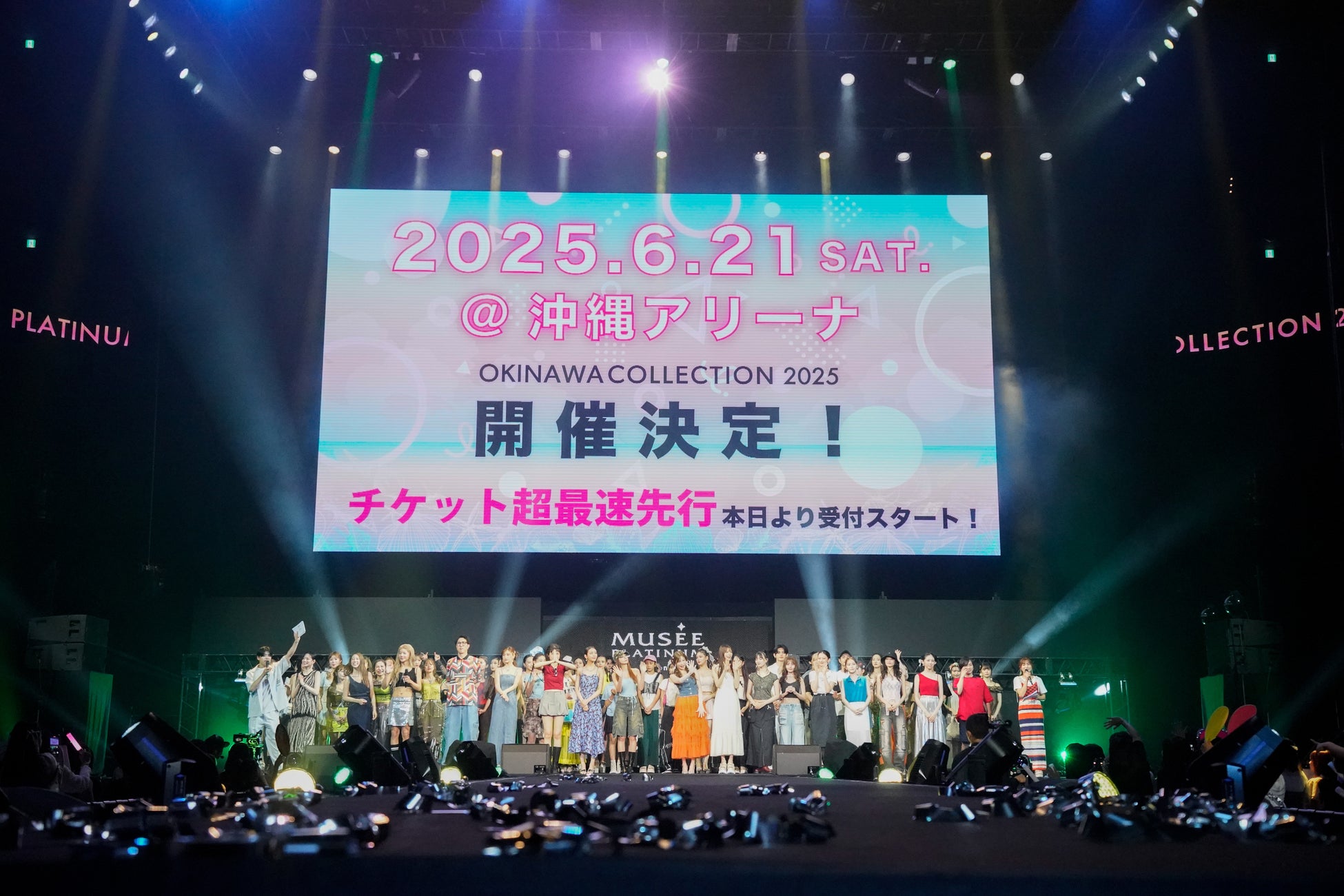 「ミュゼプラチナム Presents OKINAWA COLLECTION 2024」フィナーレには、オーディションで選ばれた沖縄のモデル21名を含む総勢69名の出演者が再登場し、華やかにイベントを締めくくりました。なお、ラストには「OKINAWA COLLECTION 2025」が2025年6月21日(土)に開催されることが発表。2024年6月23日(日)までチケットが超最速先行受付中なので、ぜひこの機会にお買い求めください。