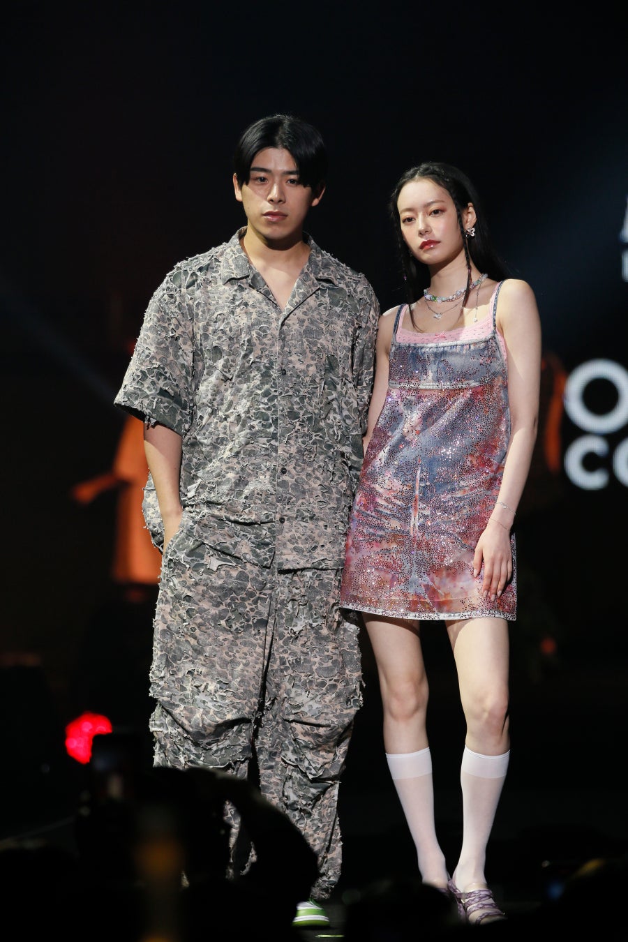 古いものが持つスタイルと、カルチャーの美点はそのままに絶妙なバランスを体現する「AZUL BY MOUSSY」はヘラヘラ三銃士がそろってランウェイを盛り上げました。モデルの元之介は夏にふさわしい爽やかなオールホワイトコーデを披露し、会場から甘い歓声が。さらに中町JP&中町綾が兄妹ランウェイ、お決まりの自己紹介「上町下町中町です」をステージ中央で披露しました。