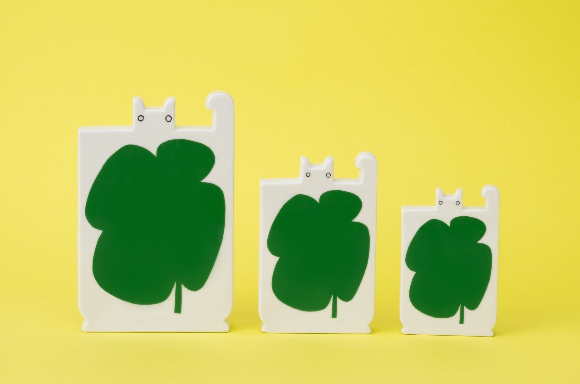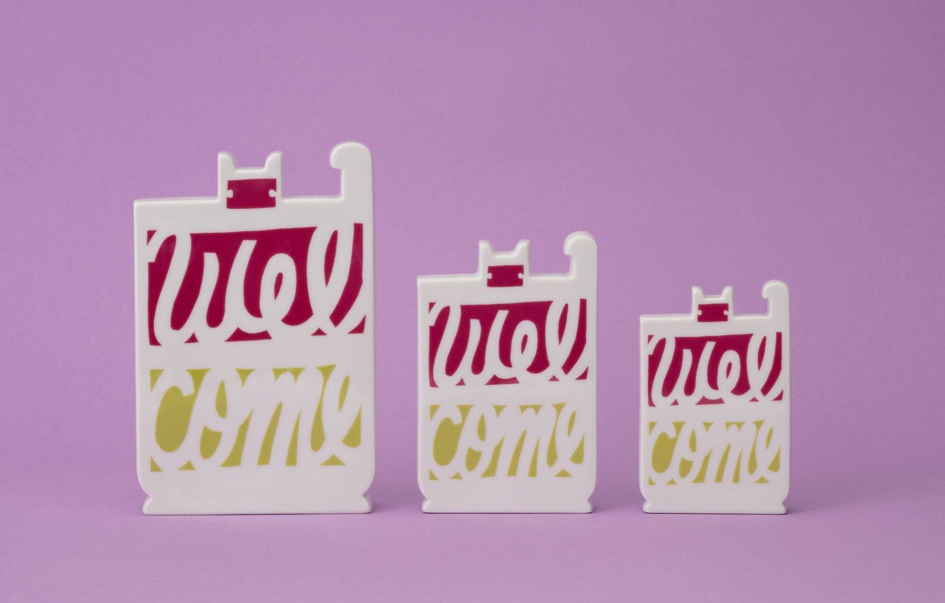 独特の感性で生み出される、シンプルでありながらも温かみがあり、日常の中にさりげなく溶け込む美しさを持つ作品たち。今回新たに発表する立体作品は、リバーシブルで飾ることのできる可愛らしい招き猫です。表面は右手上げ、裏面では左手上げとなる招き猫は、各面に異なるメッセージやパターンを施すことにより、違った印象をもたらします。また、呉須により色彩のバランスを絶妙に調整した瀬戸焼のタイルは、大きなサイズから小さいサイズまで1点ものの作品 全14点を初公開します。