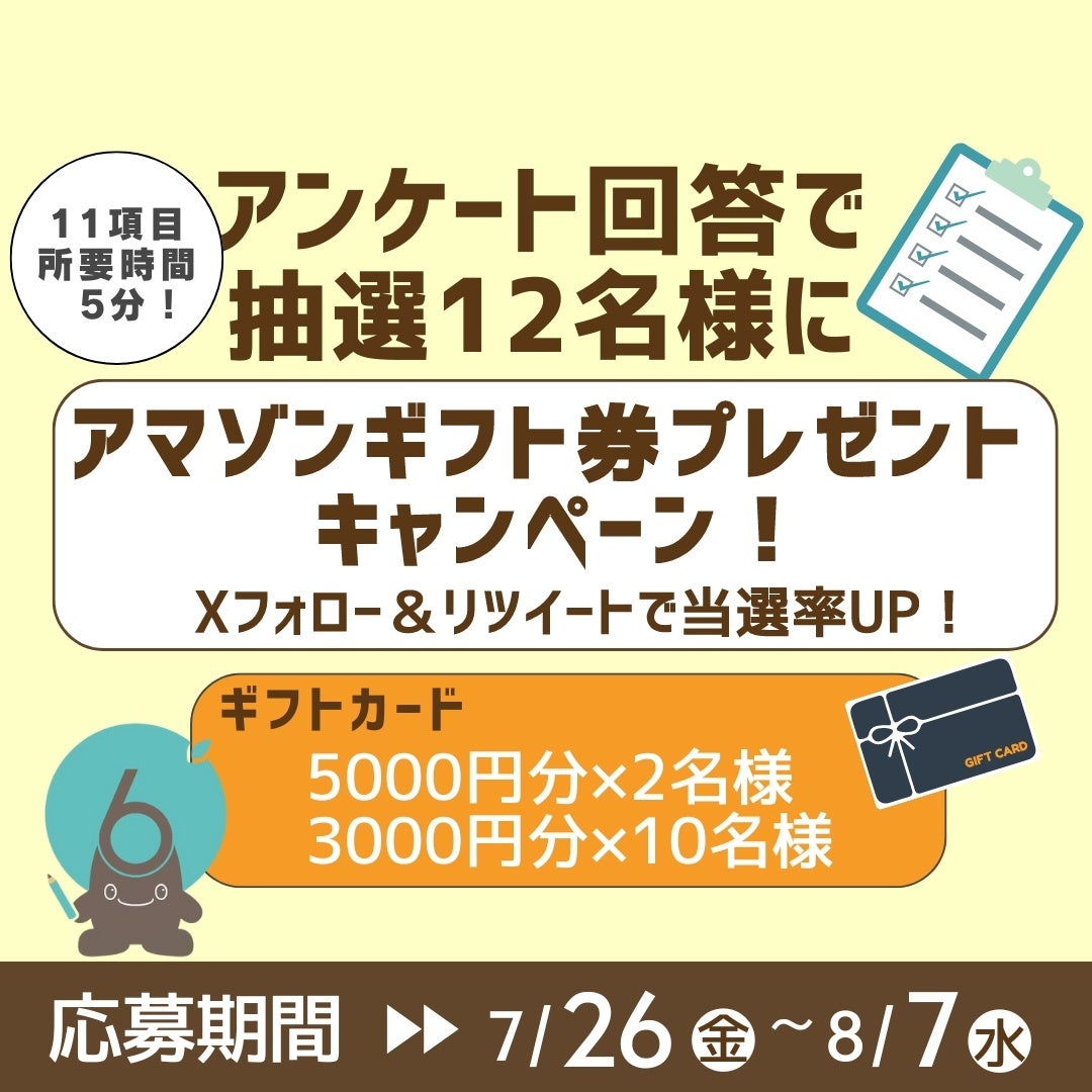 7月26日〜8月7日までの間にアンケートにお答えいただき、ご連絡が可能なメールをアドレスを登録いただきました方から抽選でAmazonギフトカードをプレゼントさせていただきます。