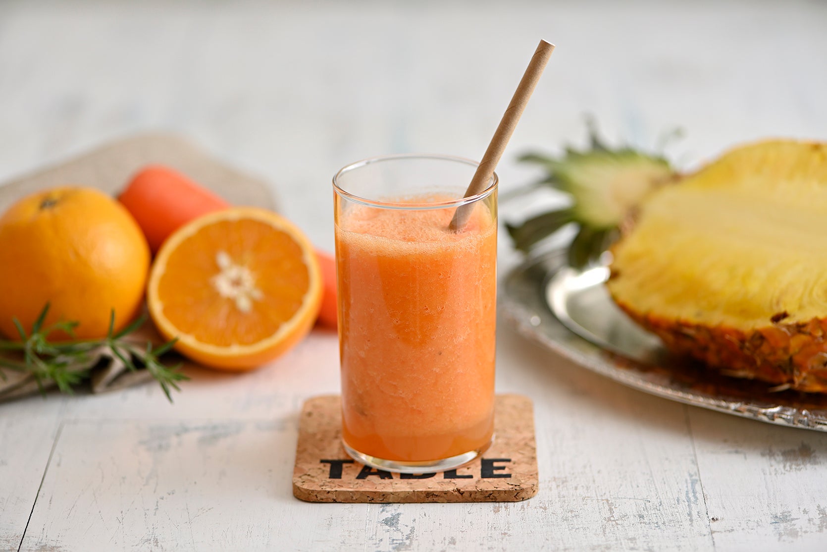 新鮮なフルーツや野菜をボトルに入れ、ハンドルを使ってボトル内を真空状態*2にします。あとはボタンを押して撹拌(かくはん)するだけ。真空状態にすることで食材の酸化(変色)を遅らせ、おいしさをキープします。