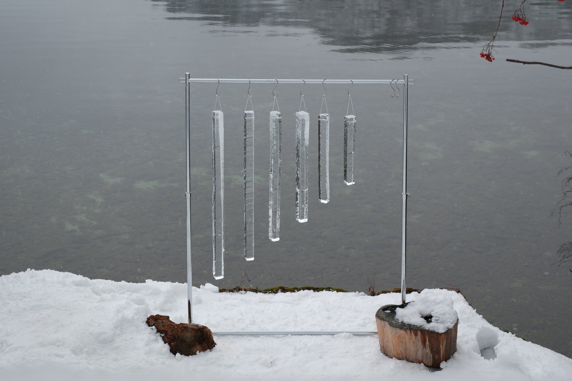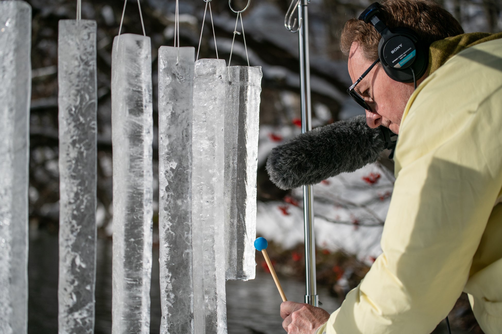 北日本の氷の世界にインスパイアされたWoodのアイデアにより、氷を楽器(アイス・マリンバ)として使用。地元の八戸製氷冷蔵で制作された氷柱はスノーモービルで慎重にスタジオへ運ばれた後、楽器として奏でられ、大地へ溶けてゆきました。繰り返し聴こえる音のモチーフは本作のセンターピースとなり、作品に自然の響きをもたらしています。