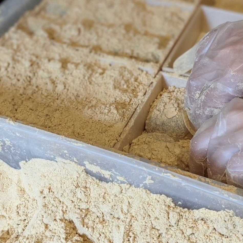 ひと粒ひと粒にみずみずしさを閉じ込めるように丸く手切りしたわらび餅に、北海道産大豆の風味や甘みを生かした特注のきな粉をふんわりとまとわせています。