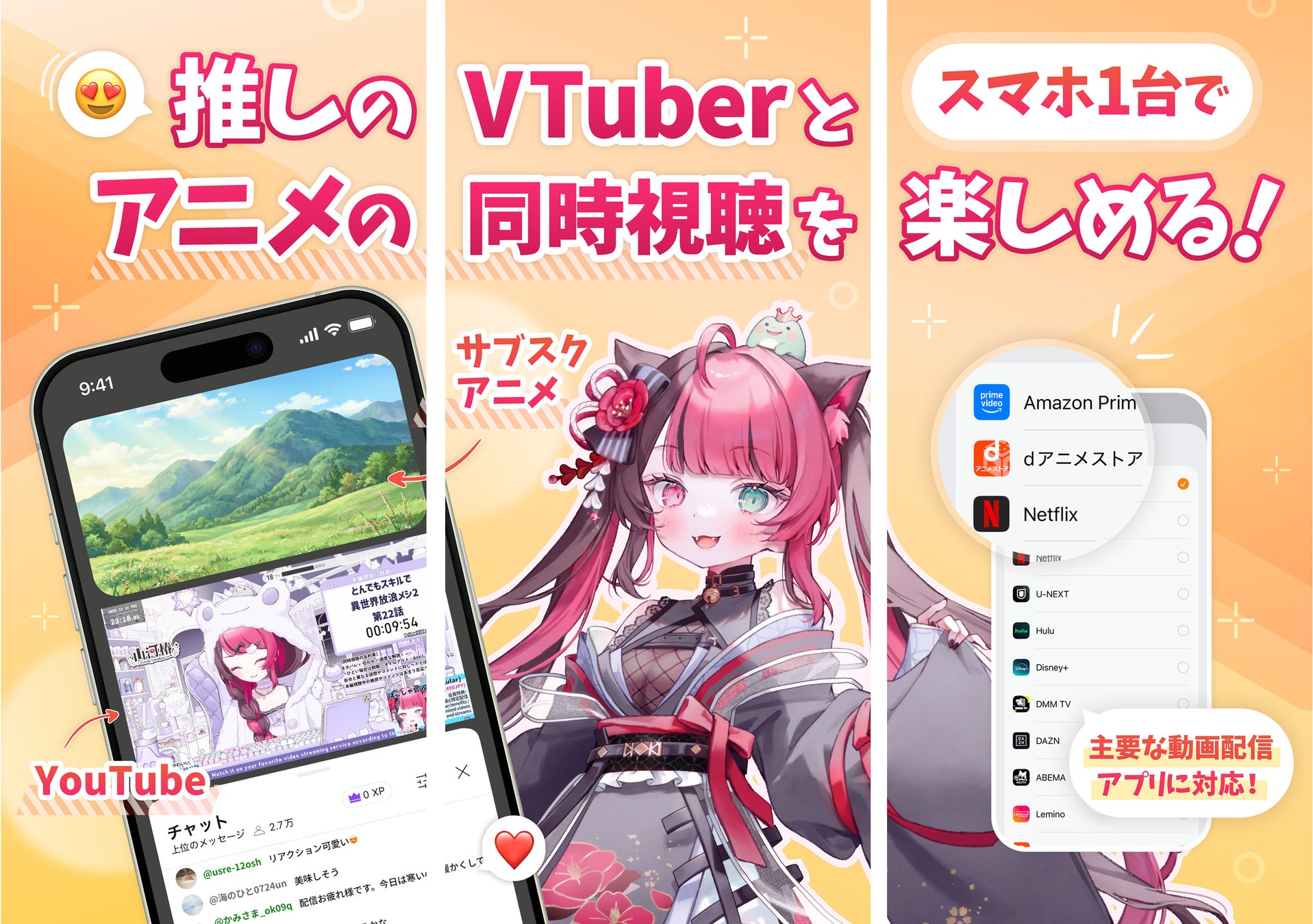 oshipartyは、各種動画サブスクのアニメ映像と、YouTube(配信者のリアクション)をスマホ1台で再生できるようにし、通勤・通学中・ベッドの中、どこでもより手軽に同時視聴を楽しめる環境を提供します。
