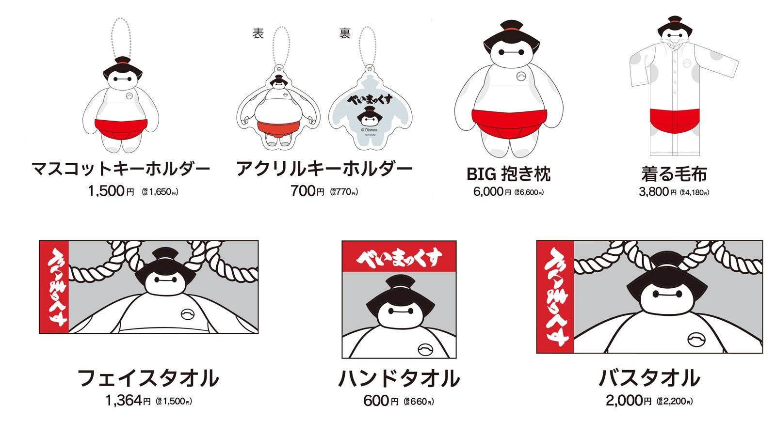 ラインナップは、定番のタオルや、お相撲さんぐらい頼もしいベイマックスを抱きしめられる「BIG抱き枕」、話題性もばっちりな「着る毛布」など7種類を展開。相撲が好きなあなたも、ベイマックスが好きなあなたも、もちろんどちらも好きな方にもおすすめの商品です。
