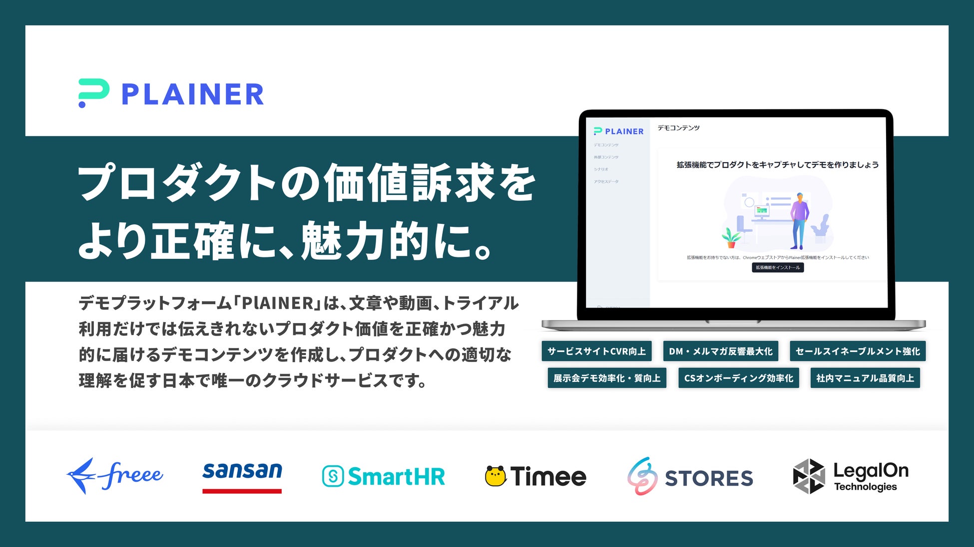デモプラットフォーム「PLAINER」は、文章や動画、トライアル利用だけでは伝えきれないプロダクト価値を正確かつ魅力的に届けるデモコンテンツを作成し、プロダクトへの適切な理解を促す日本で唯一のクラウドサービスです。