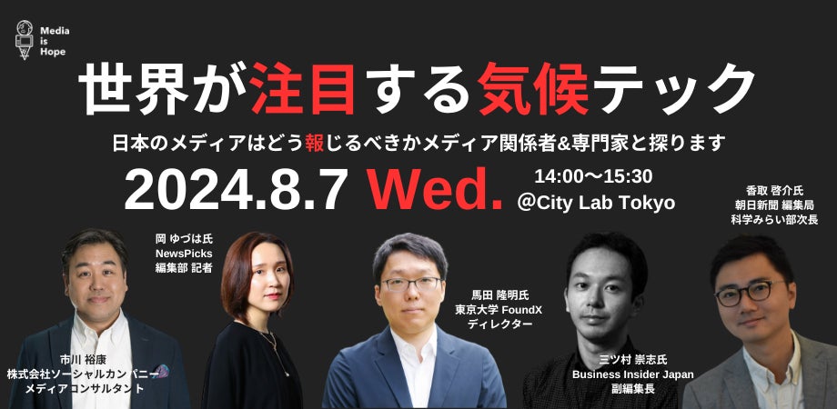 一般社団法人Media is Hopeは「気候テック」をテーマにしたメディア向け勉強会を8/7(水)にハイブリッド開催します。日本環境ジャーナリストの会と株式会社ソーシャルカンパニーが共催し、メディア関係者と専門家を招いて「気候テック」を報道する上で必要な情報を最新動向や実践例から探ります。