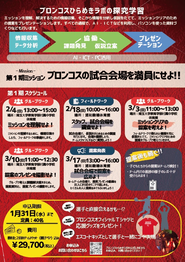 埼玉県、さいたま市から日本のリーダーを育てたい!!という熱い想いから生まれた教育カリキュラムです。実際のさいたまブロンコスで抱えている課題を情報収集しながら見つけ出し、仲間と話し合い、実際の現場に足を運び、解決策を提案する。AI×ICT×PCスキルも駆使しながら、ゲーム感覚で誰でも楽しみながら学べる探究型のカリキュラムです。第1回〜第5回のイベント型となっており、1回目には、さいたまブロンコス選手も登場!!2回目には実際の試合会場へ足を運び、現場の裏側見学やスタッフへのインタビューなどを実施。最終回は試合会場でのプレゼン動画を配信し多くの方に知ってもらえるような取り組みとなっています。