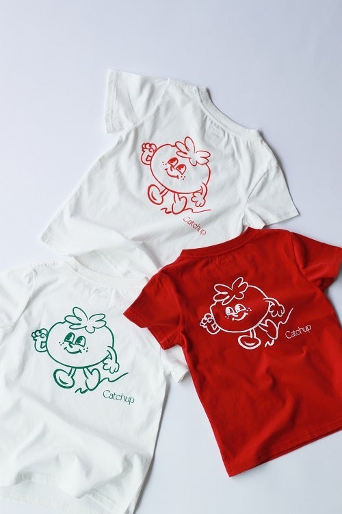 胸元にはロゴ、バックにはキャラクターのトマトくんがプリントされたCatchupならでのオリジナルTシャツ。