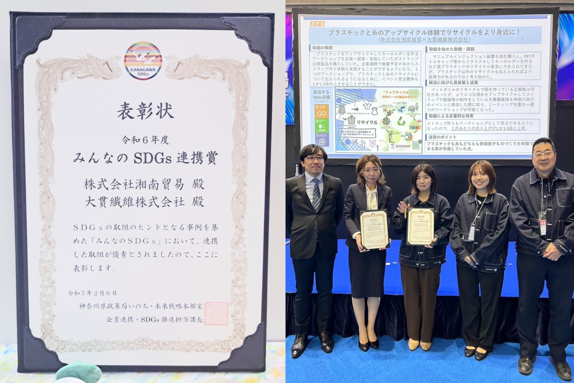 株式会社湘南貿易(本社:神奈川県横浜市西区)が、大貫繊維株式会社(本社:神奈川県愛甲郡)と合同で実施した、廃プラスチックと廃棄糸をリサイクルするワークショップの取り組みが、このたび、神奈川県主催の「令和6年度 かながわ みんなのSDGs」において、「連携賞」を受賞いたしました。