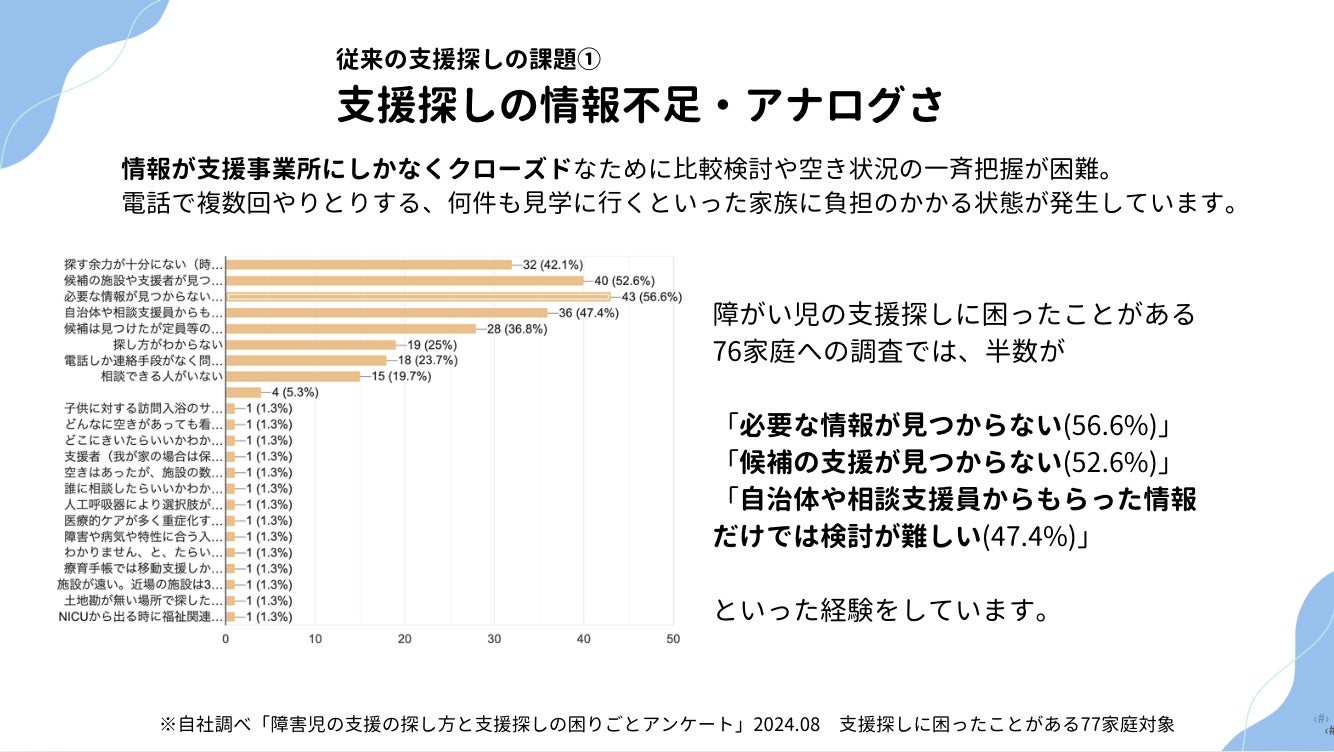 実際にファミケアで実施した「支援探しに困った経験のある家族を対象にしたアンケート」では、約半数が「必要な情報が見つからない」「候補の支援が見つからない」「自治体や相談員からもらった情報では検討が難しい」と回答しています。