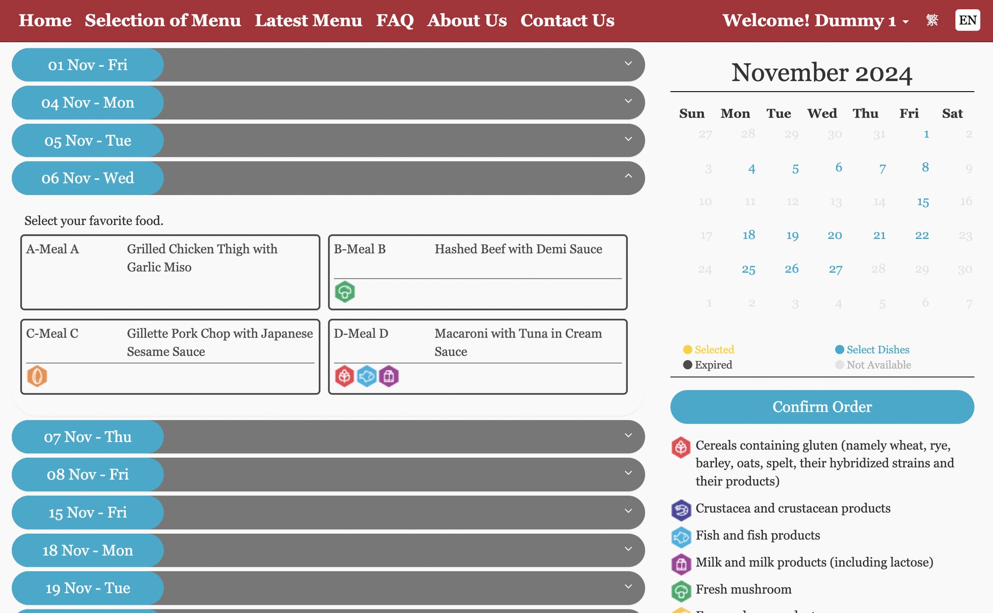 需要の高まりに応じて、保護者と学生のためにオンライン事前注文システムを導入しました。毎月末、保護者と学生は、オンラインプラットフォームを通じて弁当を選び、注文を行うことができます。支払い完了後には、食事の受け取りをスムーズにするためのQRコードが発行されます。次の月からは、学生はQRコードを使って自動販売機で簡単に食事を受け取れます。さらに、オンラインプラットフォームでは各食事のアレルゲンや特別な食材に関する情報が明示されます。この透明性によって、保護者や子供たちはアレルギーや宗教的な食事制限、個人的な好みに関する不安を取り除き、安全で楽しい食事を楽しむことができます。