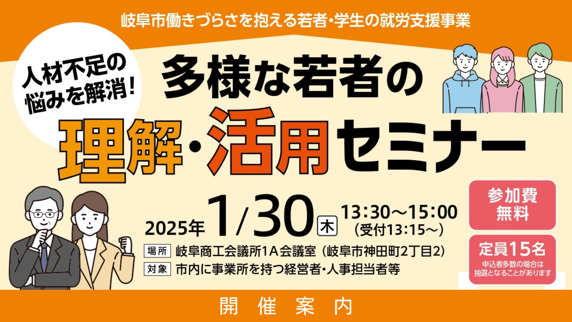 このセミナーは、岐阜市より委託を受け「令和6年度働きづらさを抱える若者・学生の就労支援事業」の岐阜市内事業者様向け企画として、当団体が運営しております。