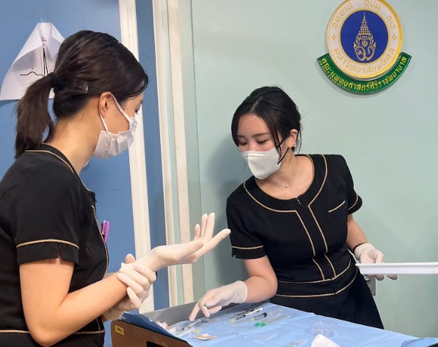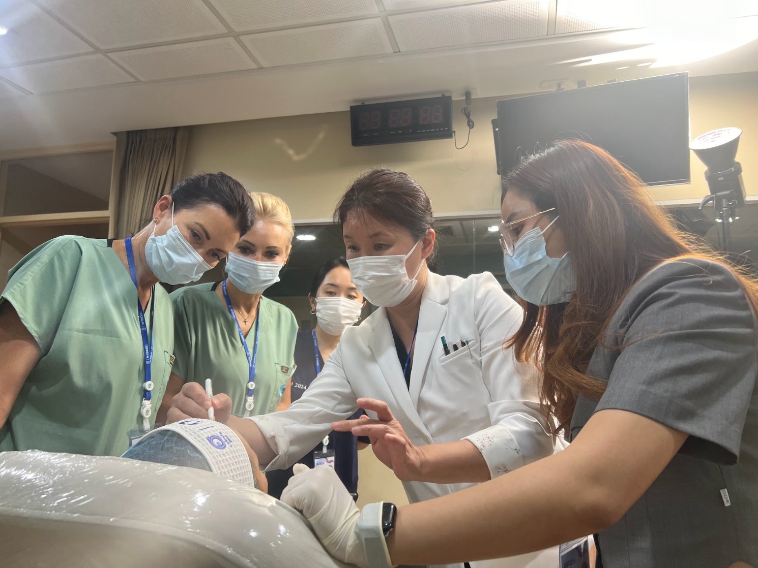 (1)ハンズオンセッションでは、吉田理事長の技術指導のもと、医療法人敬愛会の看護師2名も参加し、医療技術のデモンストレーションをサポートしました。糸リフトなどの美容医療技術を広めるために、さまざまな海外学会に積極的に参加し、国際的な視野を持つ医師の育成に力を入れています。