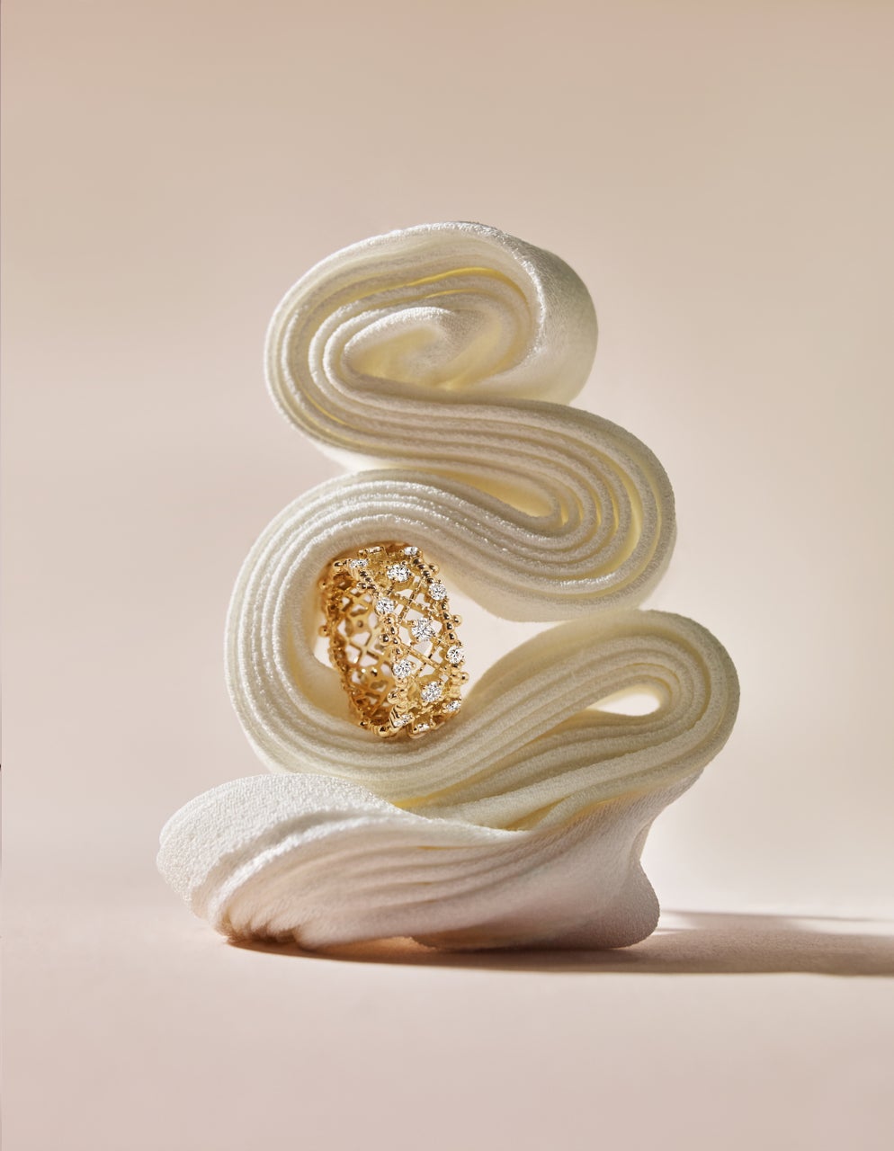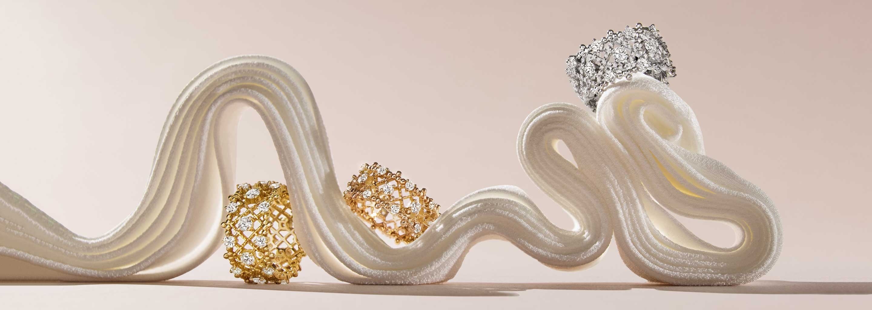 ゴールドのレースとダイヤモンドが、まばゆい輝きを放つこの2つの作品はエレガンスとモダンさを兼ね備えています。贅沢な「レトロミラノ プリマ パヴェ リング」は特別なオケージョン使いに、「リトル レトロミラノ プリマ リング」はデイリーユースに最適です。