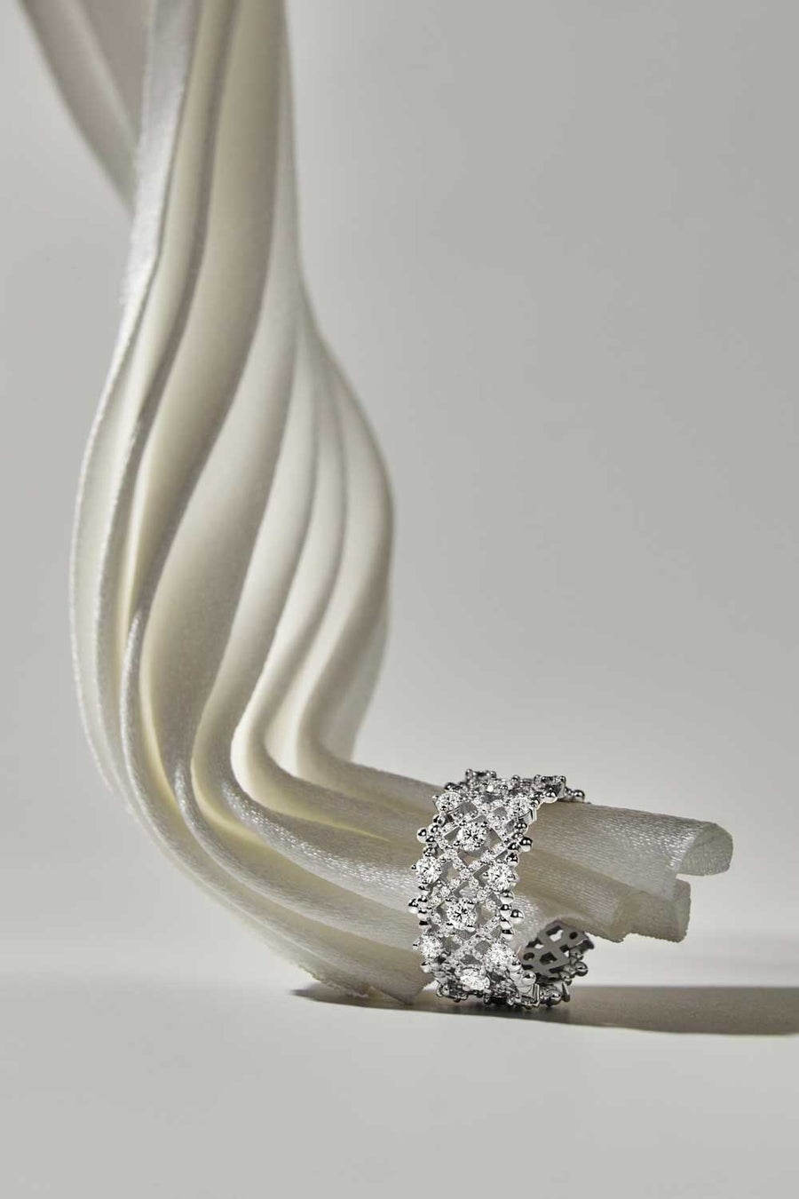 ゴールドのレースの上に 130石以上のダイヤモンドを敷き詰め、丁寧にセッティングしたこのデザインは、 まさにクラフトマンシップの賜物です。