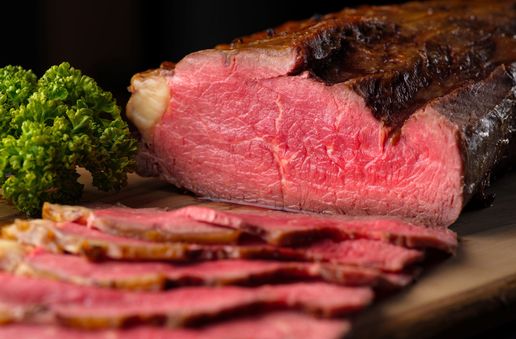 ライブキッチンでカッティングサービスを行い提供するローストビーフは、目で見ても美味しい逸品となっております。ロゼ色の断面と出来立ての味をお楽しみください。