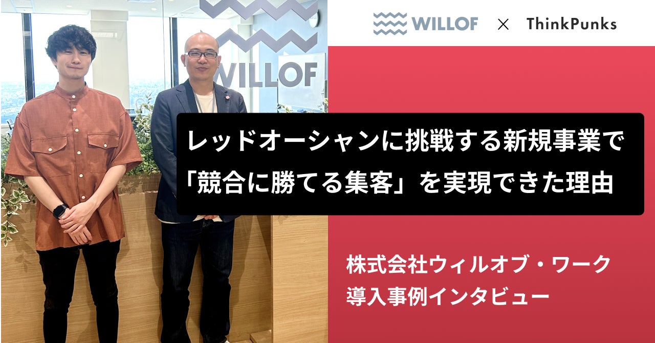 株式会社ウィルオブ・ワーク(本社:東京都新宿区、代表取締役社長:村上 秀夫)は東証プライム上場企業である株式会社ウィルグループを親会社として持ち、販売、コールセンター、介護、保育などの職種を中心に、業種・職種に特化した人材サービスを展開しています。「Chance-Making Company(チャンスメイキングカンパニー)」をビジョンに掲げ、単なる人材ビジネスにとどまらずマーケットに対して常に真摯に向き合い、新たな価値を創出し続けております。今回は株式会社ウィルオブ・ワークにおけるIT人材の紹介事業(ウィルオブテックキャリア事業)における株式会社ThinkPunks(本社:東京都渋谷区、代表取締役:朝比奈遥人)のサービス導入前の課題と、導入後どのような変化が起こったのか、株式会社ウィルオブ・ワークの松浦様と赤田様にお話をお伺いしました。