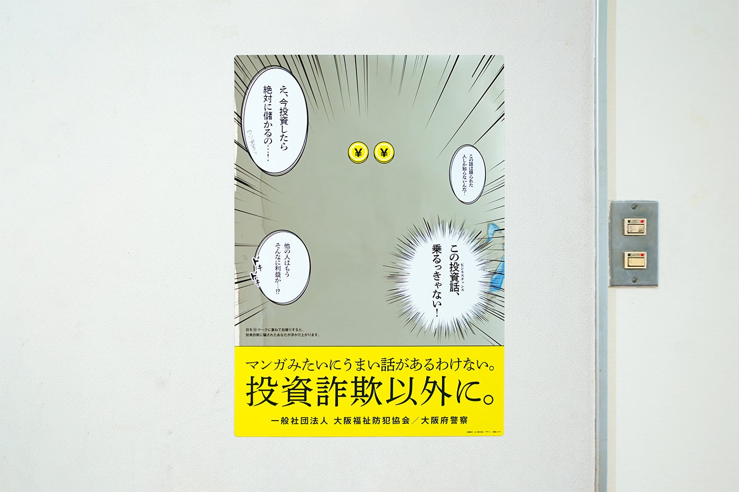 「つまらない」「みっともない」「はしたない」など、あらゆるマイナス要素「ない」からコンテンツの企画・制作を行う「ない株式会社」(所在地:大阪市淀川区、代表:岡シャニカマ)は、大阪府警察のSNS型投資詐欺啓発ポスターとして「ダマされた自分が映る鏡」を企画・制作しました。表面が鏡状になっているこのポスターには「え、今投資したら絶対に儲かるの…!」や「この投資話、乗るっきゃない!」など、SNS型投資詐欺にダマされた人のセリフが描かれており、正面に立つとダマされた自分が浮かび上がるデザインとなっています。