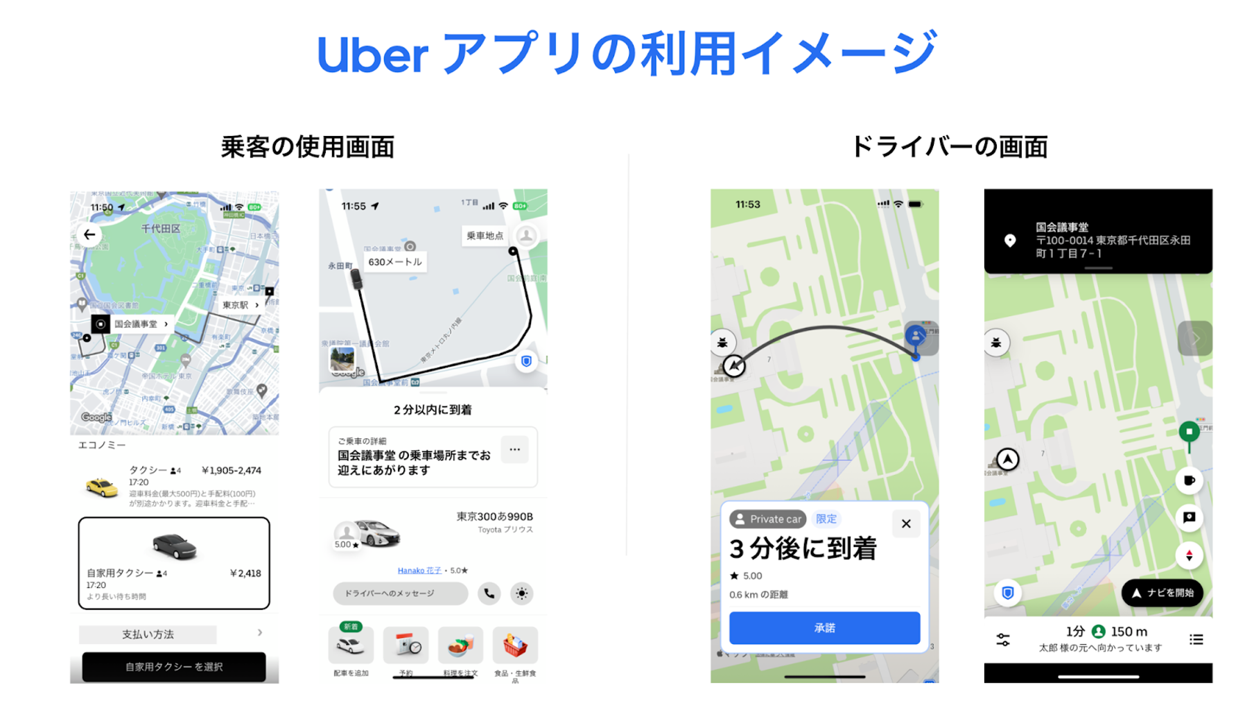 なお、Uber アプリ上では、タクシー会社によるライドシェアは「自家用タクシー」と表示されます。