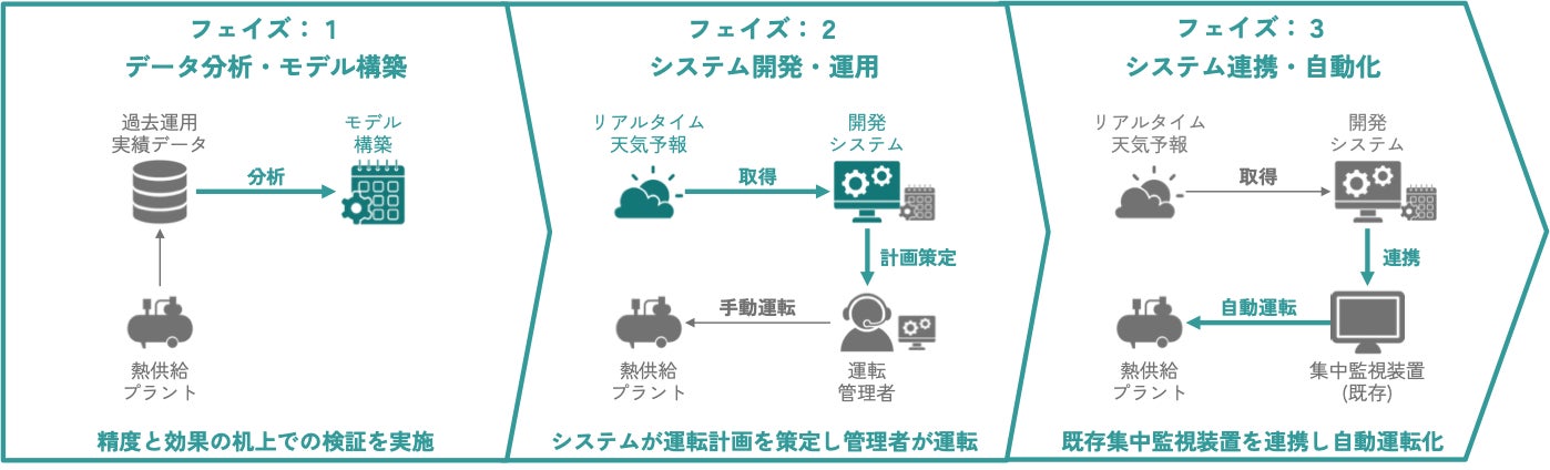 フェイズ1で構築したモデルを用いて、リアルタイム気象情報を取得し、AIで熱負荷予測と最適な熱源プラント運転計画を自動で策定する最適化予測運転システムの開発と運用を開始