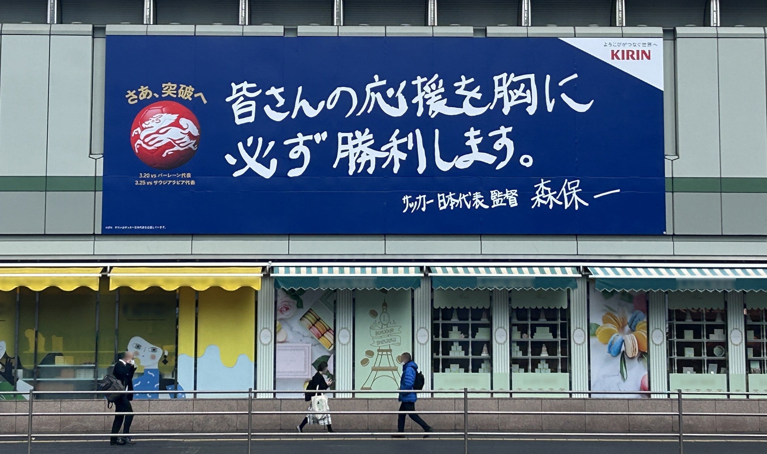 代表選手たちが決意を決めて大きな目標へ前進している中、今回のAFCアジア予選突破で最初の関門となる世界への扉を開くことができました。キリンは森保一監督が抱く日本中のサッカーファミリーと共に世界の舞台で“最高の景色”を見たいという想い、そしてアジア予選突破に向けて一緒に戦ってもらったことへの感謝を、監督の直筆メッセージという形でこの場所を通じて発信することといたしました。そしてサッカーファミリーのみならず多くの方々の心に寄り添いながら、共に最高の景色を目指す仲間を増やしていきたいという願いを込めて、AFCアジア予選突破決定後の興奮をそのままに、一夜にして大型広告を切り替えるというチャレンジをいたしました。