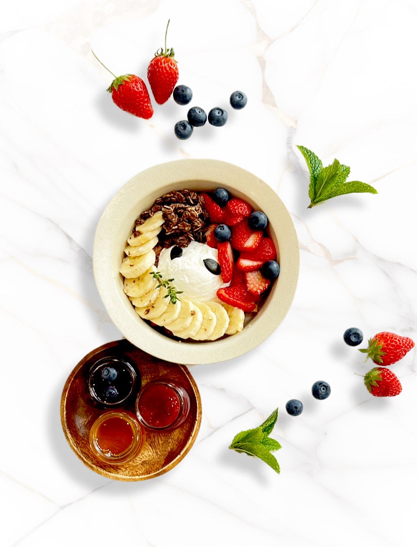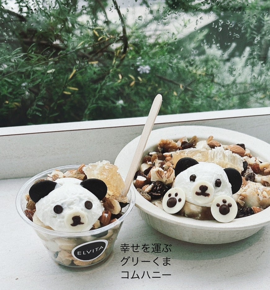 韓国の美容食として大人気のグリークヨーグルトは酸味のある乳清(ホエー)をしっかり水切りしクリームチーズのようなもっちりとした食感と濃厚な味わいが人気の秘密。ヘルシーでありながら美味しいデザートとして大人気です。ELVITAでは苺ベリー・マンゴーパイン・グリーくまの3種類のグリークヨーグルトとのラインナップ、なかでもグリーくまは開発者も一番おススメ!幸せを運ぶグリーくま のネーミングで、愛くるしいクマに見立てたグリークヨーグルトにナッツとデーツソース&はちみつの相性はバッチリ、食べたらきっと幸せを運んで来てくれるクマさんです。さらにELVITAならではのもう一つのおすすめとして、苺ベリーには自家製の極上よつ星の苺ソースを、マンゴーパインにはパッションフルーツソースを掛けてフルーツ、グラノーラと一緒にお召し上がり下さい。またグリークヨーグルトには欠かせないコムハニー(巣蜜)もトッピングとしてご用意しております。