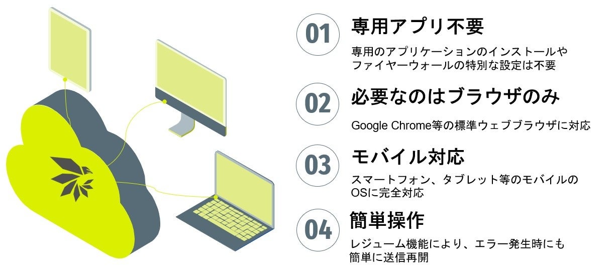 ブラウザ上で動くWebアプリケーションのため、専⽤のアプリケーションのインストールや、クライアント側の複雑な設定をすることなく、⼤容量ファイルを⾼速にアップロードやダウンロードを実現できます。