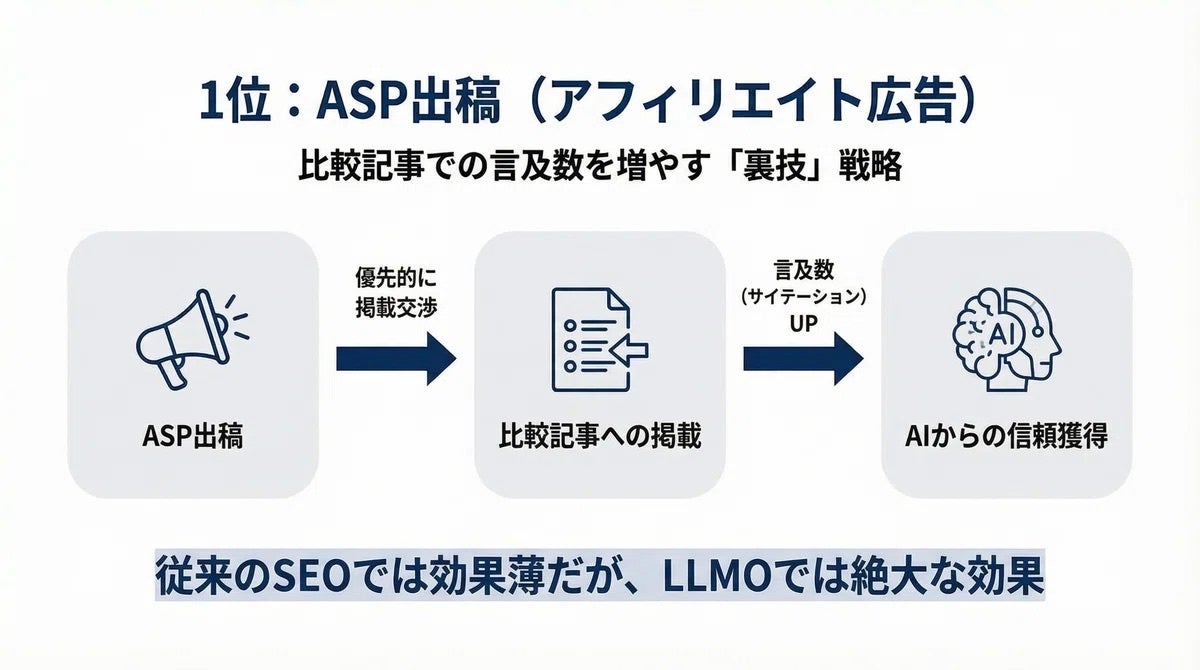 これにより、「アフィリエイト広告を出稿して、比較記事での言及数を増やす」という、これまでになかった戦略が機能します。