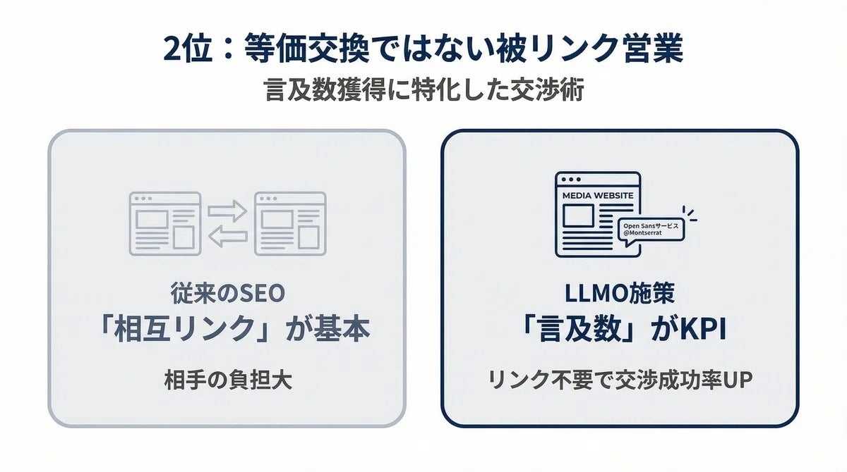 しかし、さっきも言った通り、LLMO施策のKPIは「言及数」です。なので、必ずしも相互リンクにこだわる必要はありません。