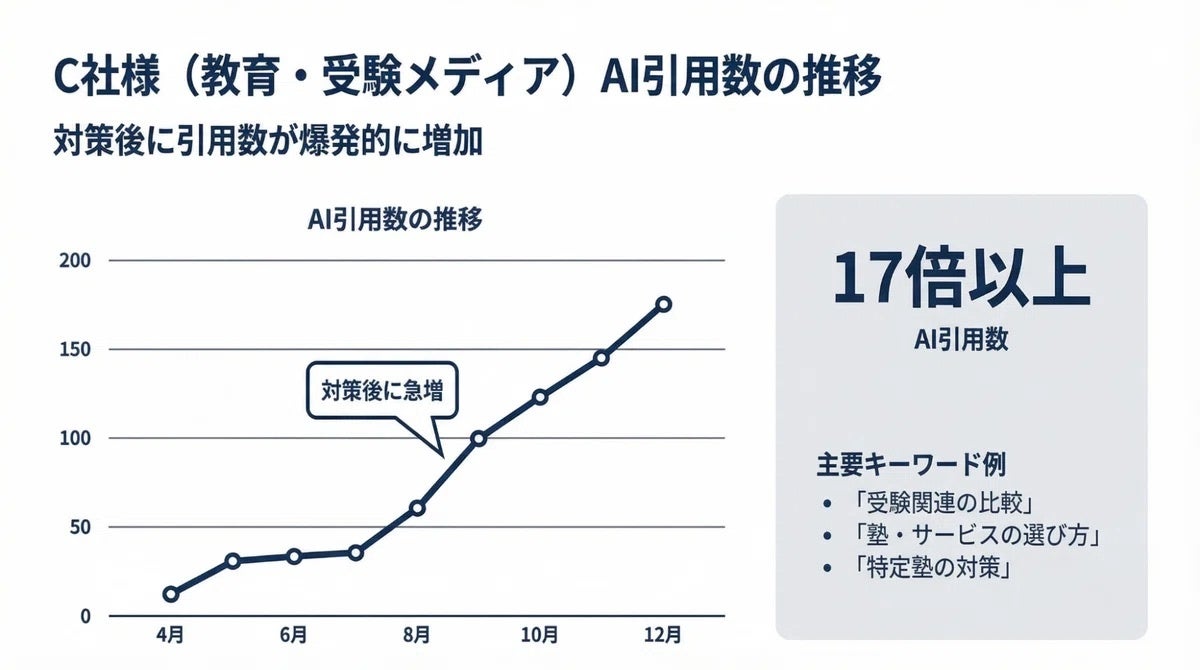教育・受験メディアC社さまでは、対策前はほぼAIに引用されていなかった状態から、対策後にAI引用数が17倍以上に爆増しました。